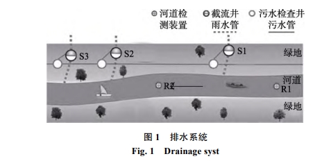 本次研究區(qū)域?yàn)槿帐兄鞒菂^(qū)內(nèi)的部分河段全長 310m,南北走向,地處亞熱帶區(qū)域,年降雨量在1400~2 000mm,最大徑流量出現(xiàn)在5至9月。河寬為 20~30 m,河道平緩,流速低,河道常水位 3.0 m,水深常年穩(wěn)定在 1.5 m左右,河道東岸人口密集,以住宅區(qū)和餐飲行業(yè)為主。河道東岸沿河鋪設(shè)截污管道,東岸管徑800mm,管道流向由北向南。雨水管由市區(qū)內(nèi)通向河道,通過管道末端設(shè)置截流井連接河道排口,見圖1。