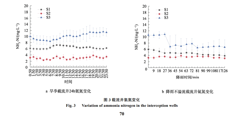 通過對5日旱季截流井水質(zhì)連續(xù)24h的監(jiān)測:發(fā)現(xiàn)旱季時 S1、S2、S3 對應(yīng)于三口井的時均氨氮濃度達(dá) 6.4、3.0、10.1mg幾,可知,三口井內(nèi)均有不同程度的污水進(jìn)人,無法達(dá)到直排標(biāo)準(zhǔn),說明該區(qū)域雨污分流改造存在問題,依然有污水流人雨水管中。三口井均未發(fā)生溢流,可知截流井內(nèi)水體從截流管中流走,截流并在旱季時能起到截污作用。