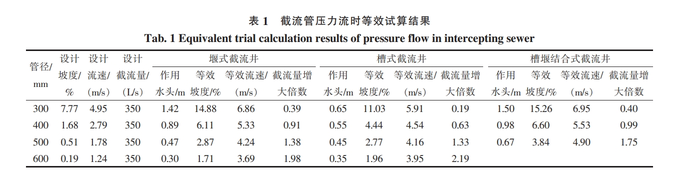 楊根權(quán)≌通過(guò)研究得出有作用水頭的截流管可等效視為一段坡度增大的無(wú)壓滿(mǎn)流管,兩者流速相差不大。筆者采用設(shè)計(jì)截流量 0=350 L/s,截流管長(zhǎng)L=20 m,截流管管徑 D=300~600 mm,當(dāng)截流管內(nèi)水流由重力流變?yōu)閴毫α鲿r(shí),對(duì)3種傳統(tǒng)截流井實(shí)際截流量進(jìn)行試算,結(jié)果見(jiàn)表1。
