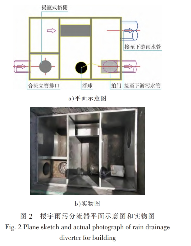 樓宇雨污分流器(見(jiàn)圖2)是針對(duì)混接排水立管分流改造的一體化設(shè)備,設(shè)置在排水立管末端,一般埋地安裝。其本質(zhì)是在槽堰結(jié)合式截流井的基礎(chǔ)上,增設(shè)微型提籃式格柵來(lái)除渣以免堵塞,增設(shè)浮球控制的拍門(mén)削減雨天較清潔的排水進(jìn)人下游污水管。設(shè)備使用前需調(diào)查混接排水立管接入情況,嚴(yán)禁馬桶或蹲坑污水接人,以免較大雜物堵塞進(jìn)水口使其功能喪失。另外,由于上游管道基本沒(méi)有調(diào)蓄容量實(shí)際使用中瞬時(shí)排水量較大時(shí),容易造成污水溢流進(jìn)入下游雨水管。