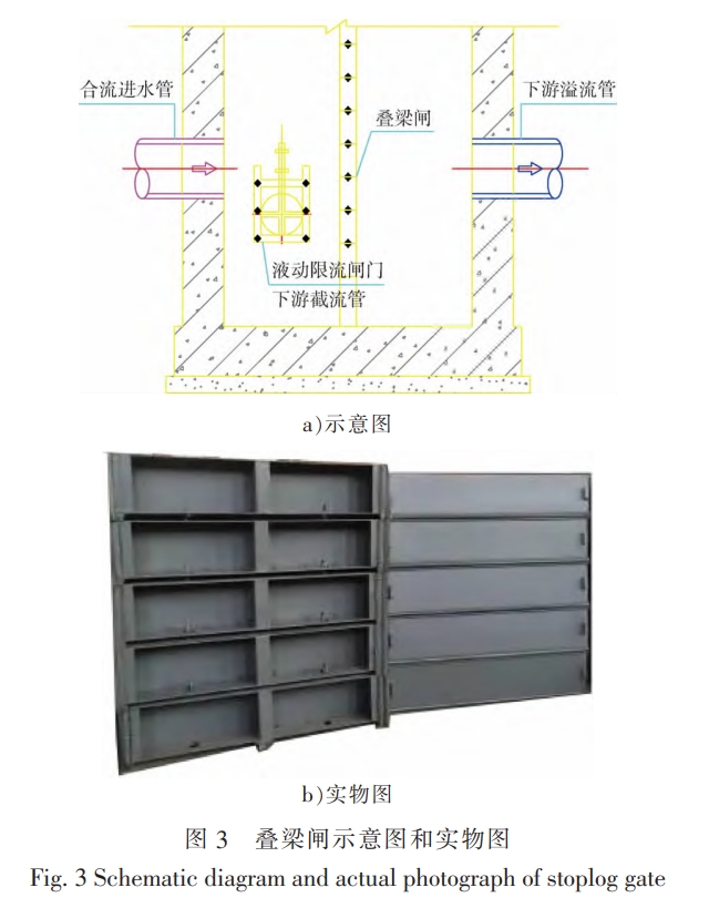 采用由多塊閥板組成的疊梁閘(見(jiàn)圖3)替代固定堰高堰墻,設(shè)置鋼絲牽引疊梁閘,四周采用止水膠條封堵,打開(kāi)或閉合不同數(shù)量的閥板以實(shí)現(xiàn)截流量的調(diào)配,用以適配不同降雨歷時(shí)或暴雨強(qiáng)度的降雨。疊梁閘較傳統(tǒng)堰式截流井使用更加靈活,但存在滲漏問(wèn)題。