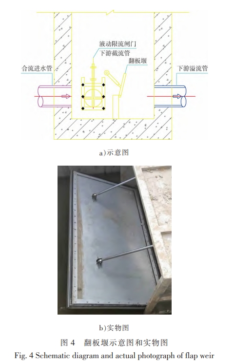 采用翻板堰(見(jiàn)圖4)替代固定堰高堰墻,堰系統(tǒng)配有傾角儀和上、下限位開(kāi)關(guān),設(shè)定井內(nèi)警戒液位,采用液位儀監(jiān)測(cè)堰門(mén)前井內(nèi)液位和堰門(mén)后自然水體液位。當(dāng)井內(nèi)液位大于警戒液位且至少大于自然水體液位0.1m時(shí),翻板堰由閉合狀態(tài)變?yōu)殚_(kāi)啟狀態(tài),開(kāi)啟角度可以調(diào)節(jié),進(jìn)而控制出水管方向的流量。翻板堰主要適用于小排口截流改造。