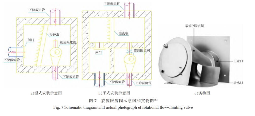 根據(jù)旋流限流閥與合(混)流進(jìn)水管是否安裝在同一隔斷井室內(nèi),旋流限流閥可分為濕式安裝和干式安裝(見(jiàn)圖7)。趙奇奇等的研究表明,旋流限流閥截流量不會(huì)隨著降雨強(qiáng)度和降雨歷時(shí)的改變而發(fā)生大幅度變化,不會(huì)對(duì)污水處理廠的日常運(yùn)行造成較大的水量沖擊。旋流限流閥的口徑越大,則重力流階段和限流階段的最大截流量越大:安裝角度越大,則重力流階段的最大截流量越大,而限流階段的最大截流量基本不變。