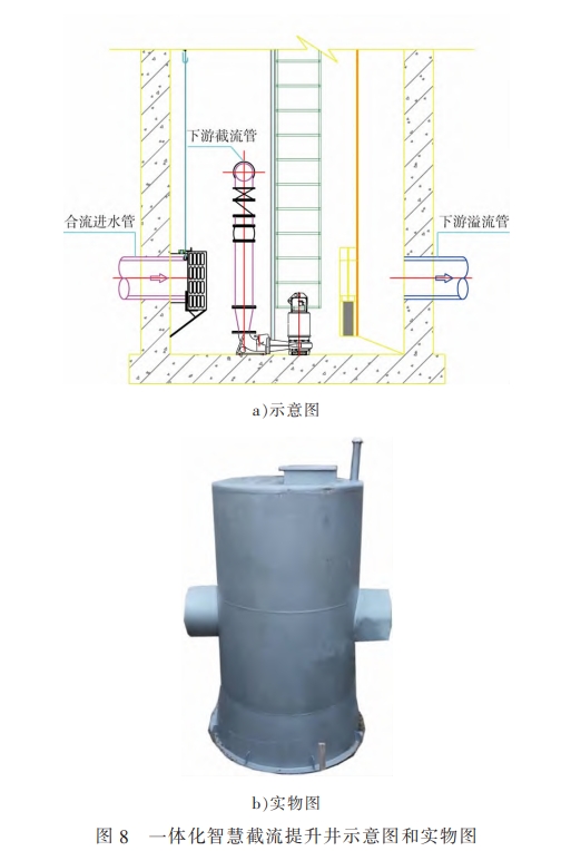 當(dāng)下游截流管高程受限時(shí),可以采用泵站截流將提籃格柵、提升潛污泵、活動(dòng)堰門(mén)、智慧控制設(shè)備等集成為一體化智慧截流提升井(見(jiàn)圖8)。施工時(shí)只需要完成基坑開(kāi)挖、底板澆筑即可,施工量小、工期短。智能控制系統(tǒng)可以實(shí)現(xiàn)遠(yuǎn)程控制、故障報(bào)警和統(tǒng)一調(diào)度,無(wú)需人員值守,其運(yùn)行維護(hù)費(fèi)用較低。王雷!8指出,一體化智慧截流提升井采用計(jì)算流體動(dòng)力學(xué)技術(shù)模擬設(shè)計(jì)的自清潔底部,能最大程度降低截流井底部淤積。