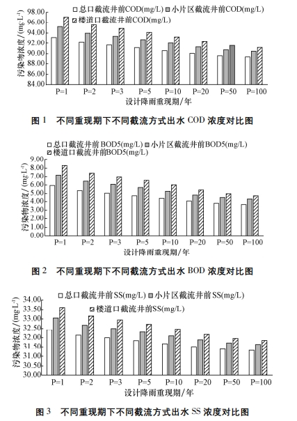理論數據分析: 經理論計算得出不同重現期下主要污染物濃度分析詳見:圖1為不同重現期下不同截流方式出水 COD 濃度對比,圖2為不同重現期下不同截流方式出水 BOD 濃度對比,圖3為不同重現期下不同截流方式出水 SS 濃度對比實測數據分析:工程實施后根據現場實測數據分析。實測結果顯示:在城中村合流制污染物濃度由于受降雨影響,均比理論值有所降低;②當每棟樓設置截流井時,其溢流污染物濃度中,COD與《城鎮污水處理廠污染物排放標準》(GB 18918-2002)中一級 B相當口;③總口截污時其溢流污染物濃度與二級標準相當;4巷道口截污污染物濃度相比總口截污約降低 1.5%;⑤從計算結果分析來看,重現期對污染物濃度的影響并不明顯。