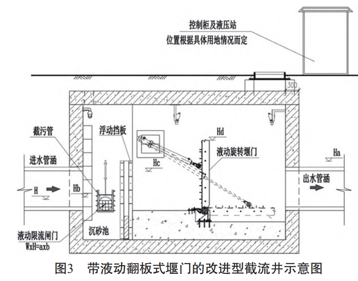 3.4 帶液動翻板式堰門的改進型截流井工作原理帶液動翻板式堰門的改進型截流井初始設定水位同帶液動下開式堰門的改進型截流井。