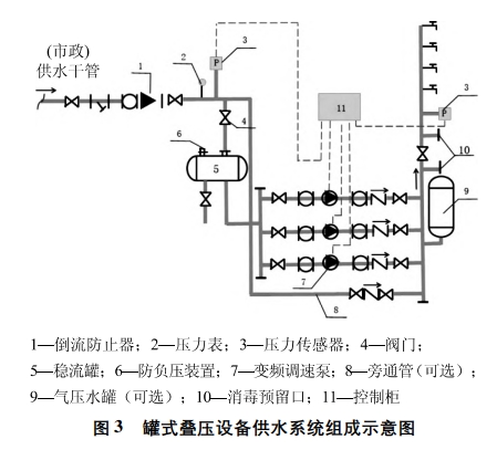 管道直聯疊壓供水技術繼水箱、工頻水泵、變頻調速水泵后發展的直接串接到市政給水管網的引入管或有壓管道上加壓的新型給水設備,可充分利用市政供水管網的壓力,減少水泵揚程,節省電耗;省去地下水池(箱)、吸水井等構筑物,節省投資,簡化系統“;可防止水在地下水池(箱)等構筑物中的二次污染和可能的溢流水損失,方便管理維護,便于水泵自動控制。其中罐式疊壓供水采用穩流補償器(壓力罐)做調蓄設施的疊壓供水設備,主要由穩流罐、變頻調速泵組、氣壓水罐、變頻控制柜、管道、閥門及儀表等組成,基本組成如圖3 所示。