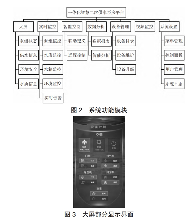 泵房?jī)?nèi)的主控系統(tǒng)采用物聯(lián)網(wǎng)云、邊、端分級(jí)架構(gòu)設(shè)計(jì),利用物聯(lián)網(wǎng)、云計(jì)算、大數(shù)據(jù)、工業(yè)智能等ICT 技術(shù),具有開放、安全、可靠、易用等特點(diǎn),為泵房提供設(shè)備廣泛物聯(lián)、數(shù)據(jù)實(shí)時(shí)采集、業(yè)務(wù)自動(dòng)化、運(yùn)維智能化等核心能力。該系統(tǒng)部署在泵房的監(jiān)控中心該系統(tǒng)主要功能包括大屏、實(shí)時(shí)監(jiān)控、智能控制、數(shù)據(jù)分析、設(shè)備管理、實(shí)時(shí)告警和系統(tǒng)設(shè)置。系統(tǒng)功能模塊如下頁圖 2所示。