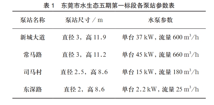 東莞市水生態(tài)五期第一標(biāo)段位于東江南部泛洪區(qū),主要河流包括寒溪河和石馬河,工程所處的河口三角洲河涌密布。屬于南亞熱帶海洋性季風(fēng)氣候。全鎮(zhèn)降雨充沛,多年平均降水量1970mm。雨量常年集中在4-9月份,占全年降水量的 87.6%。為節(jié)約工程投資,減少管網(wǎng)平均埋深,城市污水管網(wǎng)一般設(shè)計提升泵站接力排水,在低洼地段污水難以排入污水處理廠,也需要設(shè)計提升泵站。近年來隨著環(huán)境保護要求的提高泵站的穩(wěn)定運行顯得尤為重要,而泵站穩(wěn)定運行的保證需要多種措施并用,設(shè)計主要是對各類垃圾的防治,避免堵塞污水管網(wǎng)及水泵,過程安裝工作也要對質(zhì)量安全細致考慮。東莞市水生態(tài)五期第一標(biāo)段各泵站設(shè)備參數(shù)見表1。