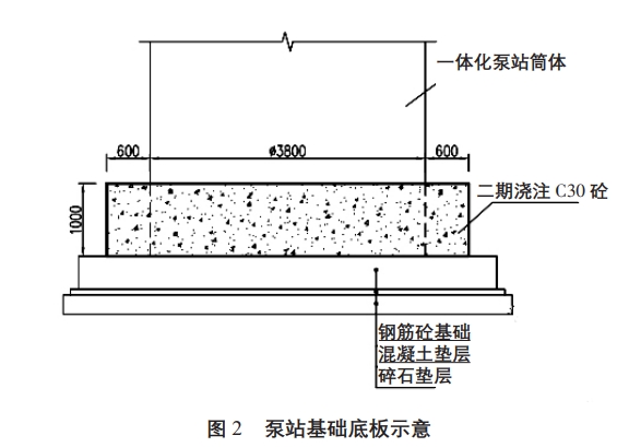 一體化泵站主體的底座和鋼筋混凝土底板應(yīng)牢固連接,連接形式應(yīng)根據(jù)抗浮計(jì)算和水泵穩(wěn)定運(yùn)行要求共同確定,澆筑混凝土?xí)r必須保證地面平實(shí),地某承載力基本容許值應(yīng)大于等于150KPa,本工程設(shè)計(jì)的泵站主體底板如圖2所示