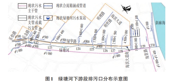 綠塘河下游段南側(cè)已建污水主管,上游接駁人民大道污水主管,沿綠塘河南側(cè)敷設(shè),污水管管徑為1000~01 200,管道長約3.5 km,下游接駁海景路污水主干管,綠塘河南側(cè)沿線污水排口均已進(jìn)行截流改造,未出現(xiàn)晴天污水溢流的現(xiàn)象。北側(cè)沿綠華路已建成污水支管,起點(diǎn)為樂怡路,沿線接駁樂金路、明理路明哲路等污水支管,終點(diǎn)于海濱大道處接入南側(cè)污水主管。因北側(cè)已建污水管網(wǎng)存在大量錯(cuò)、混、漏接,導(dǎo)致現(xiàn)狀雨水管(渠)均變成合流管(渠)即使在晴天,仍有大量合流污水溢流至綠塘河,導(dǎo)致水體黑臭。