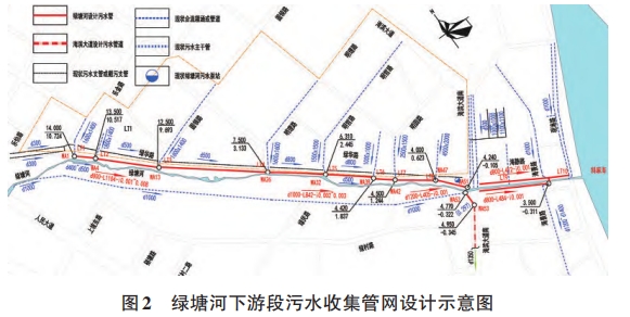 本項(xiàng)目治理目標(biāo)為工程實(shí)施后實(shí)現(xiàn)晴天污水不入河,雨天污水少溢流,基本消除水體黑臭的考核要求。結(jié)合項(xiàng)目考核目標(biāo),以問題和目標(biāo)為導(dǎo)向,通過梳理綠塘河主要污染來源,分析黑臭水體的成因,從流域綜合治理視角出發(fā),遵循“源、廠、網(wǎng)、河”系統(tǒng)性思維,提出控源截污、暗渠清污分流9、河道清淤、活水保質(zhì)、生態(tài)修復(fù)等綜合治理措施。綜合考慮現(xiàn)狀污水收集設(shè)施、項(xiàng)目投資、工程可實(shí)施性等因素,在控源截污措施方面設(shè)計(jì)擬沿綠塘河北側(cè)新建污水主管,分別接入海濱大道、海景路污水主干管,沿線污水直排口接駁進(jìn)污水主管,合流排污口通過設(shè)置截流井的方式收集合流污水及初期雨水,如圖2所示,
