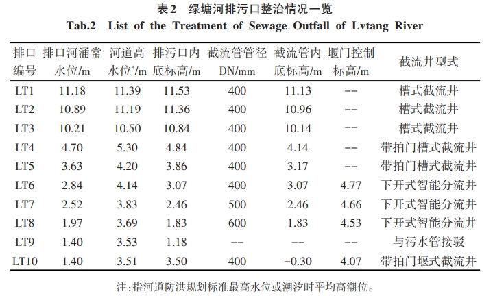 沿河排污口截流井的選擇是控源截污重要措施之一,對流域治理效果的影響至關(guān)重要。根據(jù)綠塘河下游段排污口的服務(wù)范圍、斷面尺寸、管(渠)內(nèi)底標(biāo)高、河涌水位、潮位影響等因素,設(shè)計(jì)截流井選擇需綜合考慮多項(xiàng)因素,選取合理可行的截流井形式。LT1~LT3排污口,內(nèi)底標(biāo)高均在歷年高潮位8.0m以上,即使在降雨且受潮位頂托時(shí),河水倒灌的幾率極低,可選擇槽式截流井。LT4~LT5 排污口,內(nèi)底標(biāo)高在平均高潮位3.51m之上,在歷年高潮位8.0m以下,日常受潮位影響較小,但在降雨且受潮位頂托或天文大潮時(shí),存在河水倒灌風(fēng)險(xiǎn),可選擇帶拍門的槽式截流井或智能分流井LT6~LT8排污口,內(nèi)底標(biāo)高在平均高潮位3.51m之下,選擇槽式截流井時(shí)河水倒灌的幾率極高,尤其是 LT7、LT8排污口斷面尺寸較大,河水倒灌時(shí),對污水主管水質(zhì)水量的影響較大,容易導(dǎo)致上下游污水主管冒溢的現(xiàn)象可選擇智能分流井或堰式截流井,但是選擇堰式截流井在雨天時(shí)易導(dǎo)致上游內(nèi)澇。LT9為污水直排口,應(yīng)予以封堵,將污水就近接人市政污水管網(wǎng)。LT10內(nèi)底標(biāo)高在平均高潮位3.51m之下,應(yīng)選擇智能分流井或堰式截流井,然而受周邊建設(shè)用地限制,只能選擇堰式截流的方式將污水收集至污水管網(wǎng)。因此,各排污口的截流井設(shè)計(jì)選型如表2所示。