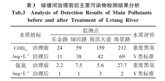工程實(shí)施后,綠塘河下游段沿河的污水直排口實(shí)現(xiàn)晴天污水不人河,雨天污水少溢流,水體黑臭現(xiàn)象基本消除的治理目標(biāo),順利通過廣東省及生態(tài)環(huán)境部的考核評估。通過表3項(xiàng)目實(shí)施前后的監(jiān)測數(shù)可知,水質(zhì)得到極大的改善,由重度黑臭提升至V類水標(biāo)準(zhǔn)。