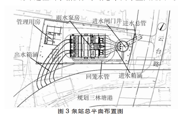 在泵站內(nèi)設(shè)置獨(dú)立管理用房,其內(nèi)配置會議室、辦公室、休息室、茶水間、衛(wèi)生間及浴室等設(shè)施。為保證雨水泵站出水條件良好,管理用房采用“L”形,避讓出水箱涵。泵站總平面布置圖見圖3.