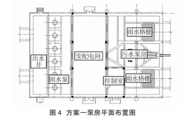 方案一。雨水泵房為雨水直進(jìn)直出的矩形泵房,在雨水泵房中間設(shè)置污水截流泵房",正向出水。主泵房上部不設(shè)置設(shè)備房間,起重設(shè)備采用單梁門式起重機(jī),僅在主泵房集水池上部設(shè)置變配電間及控制室(見圖4)。