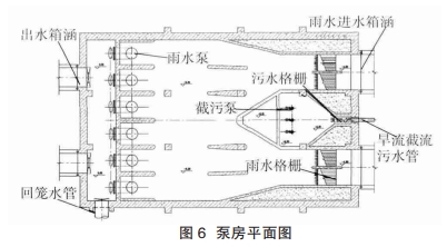 污水截流泵房設(shè)置在雨水泵房中間,在雨水格柵井、污水截流設(shè)施格柵井處設(shè)置封閉式臭氣收集罩。格柵間散發(fā)的臭氣收集后,經(jīng)處理達(dá)標(biāo)后排放。泵房平面圖見圖6