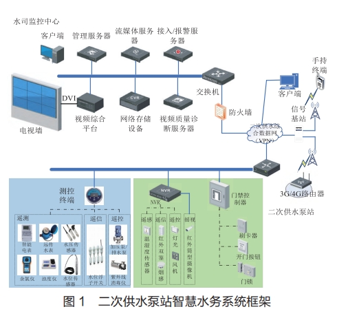 智慧水務(wù)是智慧城市中非常重要的組成部分,作為城市供水管網(wǎng)重要節(jié)點的高坪偏遠地區(qū)供水加壓泵站智慧化運行更是實現(xiàn)智慧城市的基礎(chǔ)保證。通過對二次供水相關(guān)主管部門調(diào)研,并結(jié)合各地水司二次供水泵站接收管理規(guī)范,日常管理中的主要需求包括:在二次供水有限公司建設(shè)監(jiān)控中心以監(jiān)視泵站情況實現(xiàn)集中維護、每個泵站安裝視頻監(jiān)控設(shè)備監(jiān)控供水設(shè)備允許狀態(tài)、遠程監(jiān)視泵站視頻圖像、監(jiān)視異常情況(門禁開啟、人員入侵、火災(zāi)報警、泵站溫濕度)、遠程控制(燈光排風(fēng)、門禁等)開關(guān)、監(jiān)視水池水位流量等信息、泵站供電電流電壓等信息、遠程控制供水系組的啟停等。