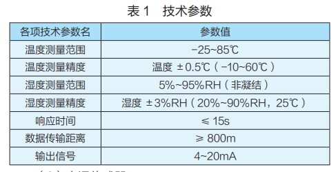 此類傳感器為傳感、變送一體化的設(shè)計,能夠根據(jù)被測場地調(diào)整傳感器配置數(shù)量。通過 4-20mA 接口與主機相連并采用模擬量來對濕度、溫度進行表達。控制中心、泵站也能夠通過系統(tǒng)實時檢查儀器室的環(huán)境變化,并對空調(diào)、新風(fēng)系統(tǒng)等進行遠程控制。主要技術(shù)參數(shù)可參考表1。
