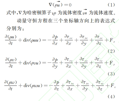 流體流動時遵循物理守恒定律,包括質量守恒定律、動量守恒定律和能量守恒定律,每個守恒定律都有相應的控制方程。本文研究的泵站及其流道在正常運行時流道內的水溫不隨時間的變化而變化,計算時忽略熱交換,不需考慮能量守恒方程。質量守恒方程也稱連續性方程式中,