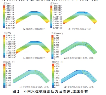 不同水位虹吸形成時虹吸管駝峰段壓力、流速、流線分布見圖2。平均壓力分別為0.112x10'、-0.118x10'、-1.600x10'Pa(圖 2(a)~(c)),平均流度分別為 1.423、1.506、1.255 m/s(圖2(d)~(f))。不同水位下壓力均勻分布,最小壓力均位于駝峰段,最大壓力均位于人口與出口部分,出水池的水位變化對最大壓力值的影響相對較小,主要影響最小壓力值。與最低水位相比,最高、設計水位流速分布更加均勻,可見出水池水位較低會使虹吸段流速分布不均;水位較高對虹吸管整體流速分布影響較小。