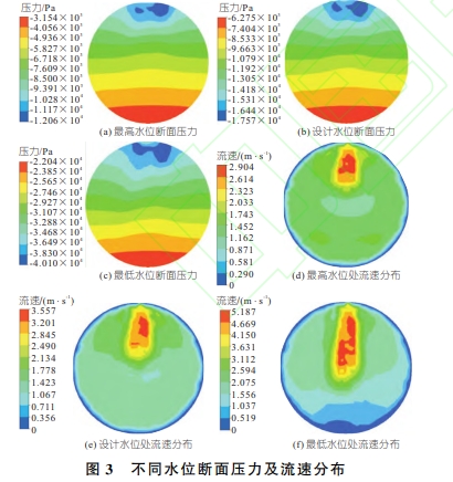 不同水位虹吸形成時斷面壓力、流速分布見圖3。平均壓力分別為一0.717x10'-1.116x10'、-3.008x10'Pa(圖3(a)~(c)),平均流速分別為 2.107、2.355、2.008 m/s(圖 3(d)~(f))由圖 3(a)~(c)可知,該斷面壓力由上至下逐漸增大,壓力基本呈均勻分布,分層明顯,在靠近真空閥處局部壓力不均。由圖3(d)~(f)可知,該斷面流速受真空閥影響極大,在真空閥下方形成了與其他區域明顯不同的高流速區,可以推測真空閥能在本文工況下水力挾氣階段排出大量氣體,對機組啟動、虹吸形成過程起到明顯的促進作用。并且隨著出水池水位的降低,真空閥造成的高速區范圍增大,導致該區域流速分布不均。