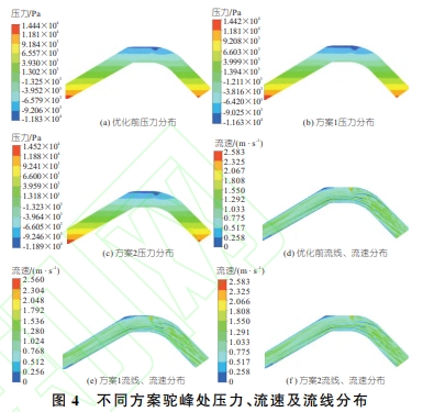 c.對駝峰段角度進行優化,優化前、方案1、方案2對流場分布影響不大,主要影響虹吸形成時間。3種方案虹吸形成時間分別為504、518、448s,駝峰段前角度增加10,,可有效縮短虹吸形成時間。