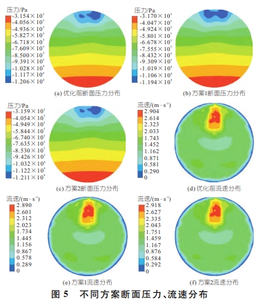 不同方案虹吸形成時斷面壓力、流速分布見圖5。平均壓力分別為-7.244x10-7.289x10:-7.230x10'Pa,平均流速分別為 1.595,1.588、1.603 m/s。優化前方案 1、2 的壓力、流速分布一致,平均壓力和平均流速的數值大小為方案2>優化前>方案1。在分布上頂部真空破壞閥區域的壓力值有明顯區別,優化前與方案2最小壓力區相似,方案1最小壓力區與二者不同;方案2與優化前最值速度區相似,均與方案1最值速度區略微不同。