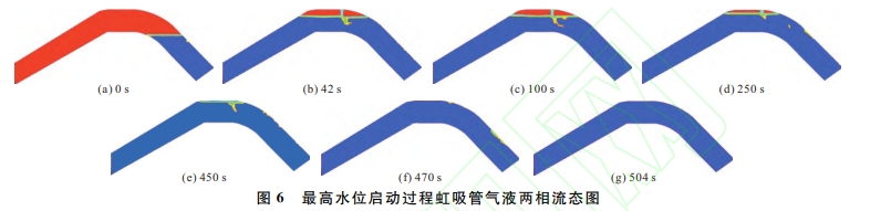 出水池最高水位泵站機組啟動過程虹吸管氣液兩相流變化見圖6,該工況虹吸形成時間為504如圖6所示,0s時啟動過程開始,管內兩相流分布;42s時流道內空氣已大量減少,原因為啟動過程開始后先進行水力驅氣階段,特點是時間短,排氣多。42s后進入水力挾氣階段,真空閥開啟。水流翻過駝峰段,管內空氣被持續壓縮,管內壓力持續上升,管內空氣多被真空閥排出,下降段水體逐漸變得穩定,該階段約持續430s。此后,絕大多數空氣已排出,管內氣體以氣團形式存在,真空閥關閉,剩余空氣只通過水流挾氣作用排出,排氣速度減緩直至排盡。水力挾氣階段總耗時約460s,最終流道內空氣被全部排出。水力挾氣階段后進入虹吸穩定階段,管內只剩水。啟動過程結束,管內變為穩態流動。